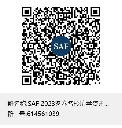 加入SAF QQ群(群号:614561039):备注国内大学+姓名,SAF将在群里发布各类交流项目的详细资料、线上宣讲会具体时间、链接等。