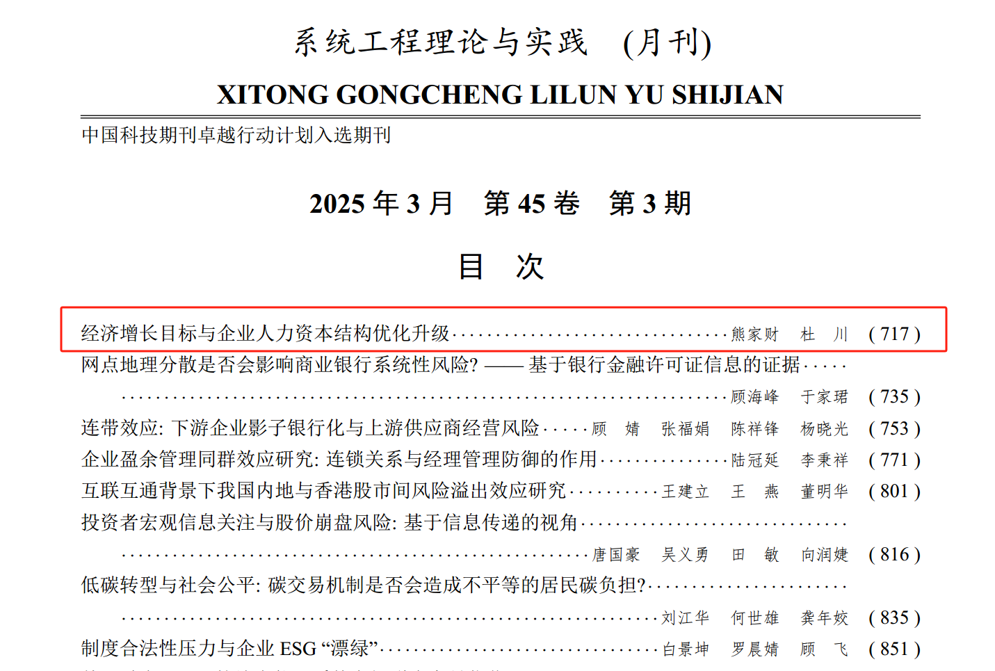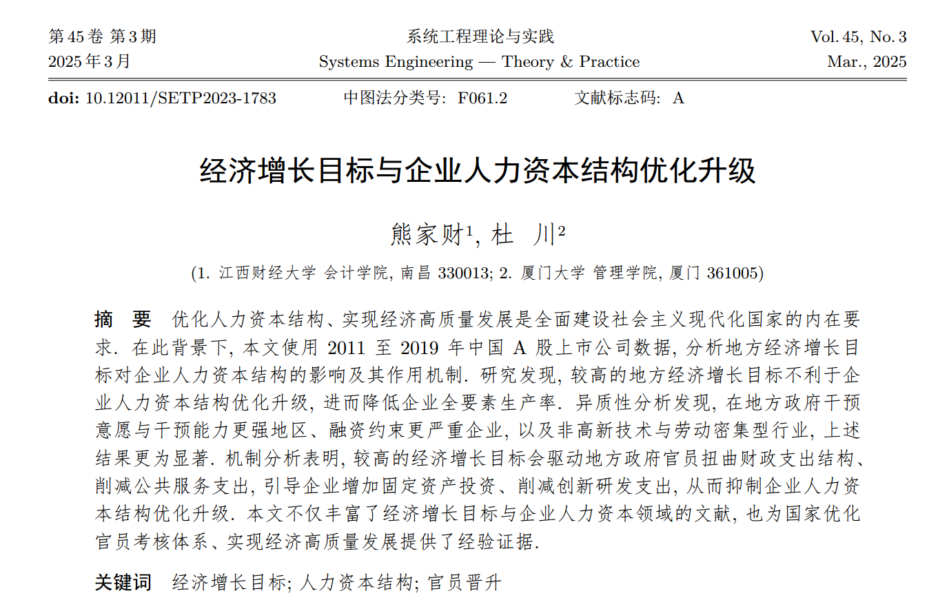 近日,熊家财教授与厦门大学博士生杜川合作完成的论文《经济增长目标与企业人力资本结构优化升级》发表于国内权威A期刊《系统工程理论与实践》2025年第3期。